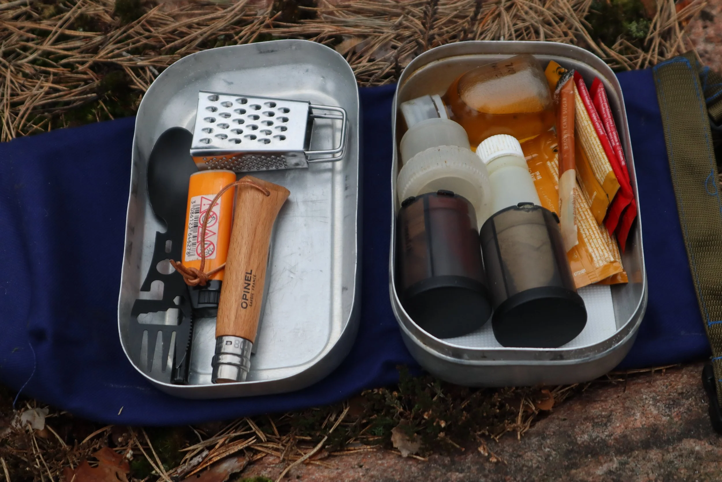 For “hardware” I keep a lighter, a mini grater, for nutmeg, parmesan etc, a spork and an Opinel No 8 for food prep.